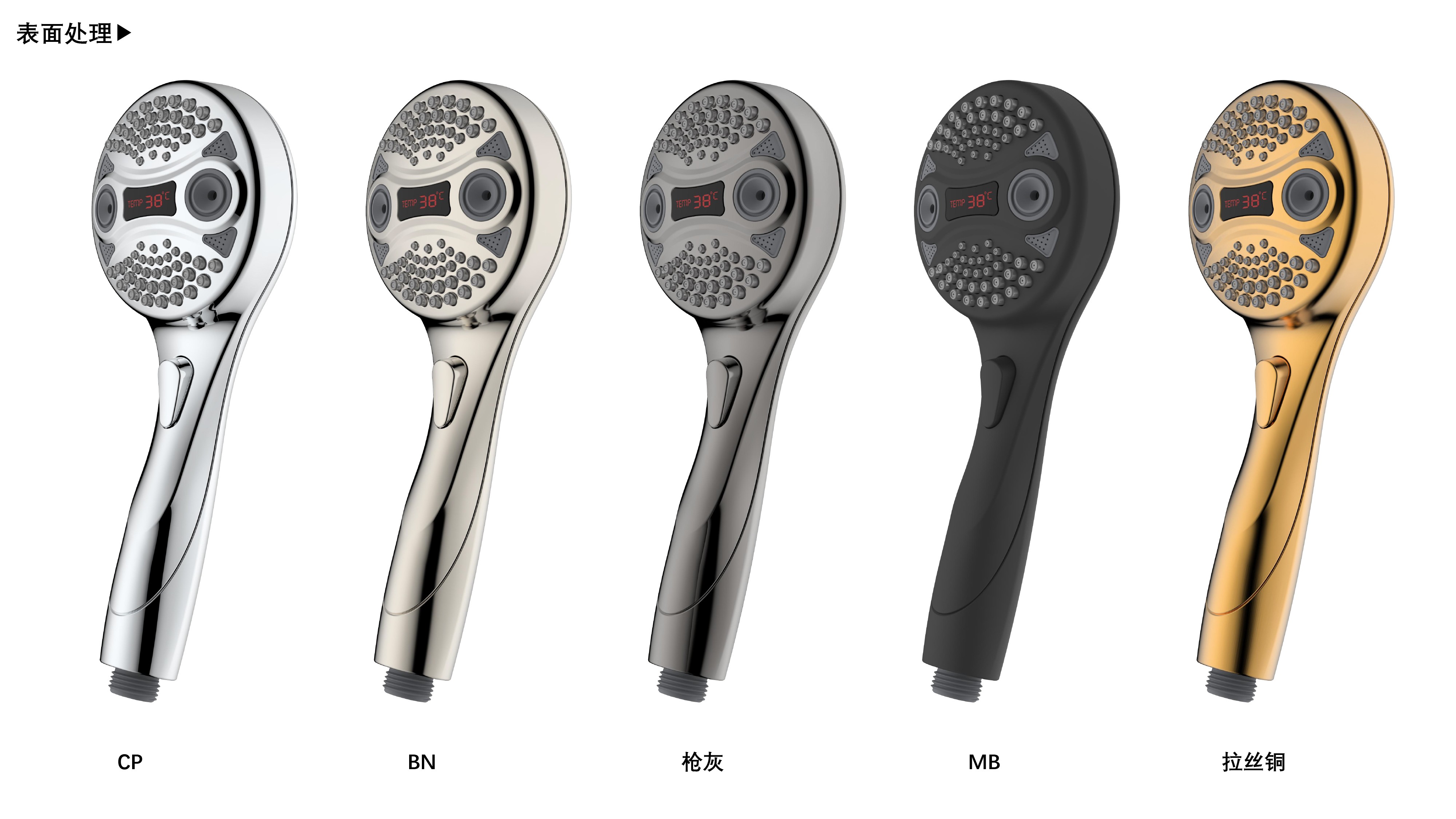 三功能溫顯花灑;獨(dú)特E.T.外觀設(shè)計(jì);TPR出水孔,輕撥除垢;LED三色出水,看得見(jiàn)的水溫;按鍵切換三檔模式出水;握感舒適防滑